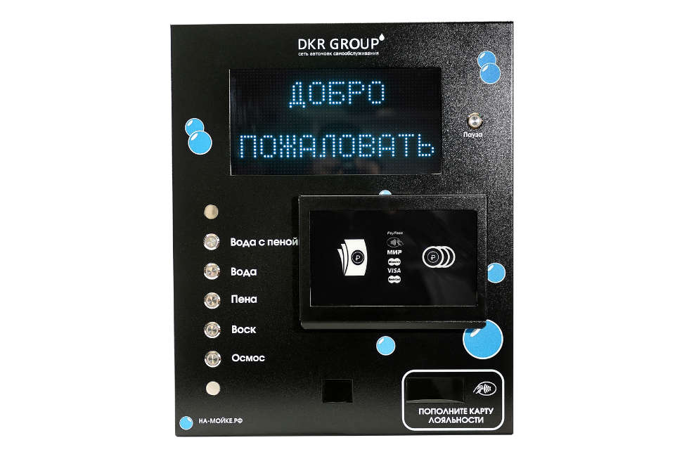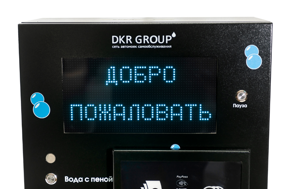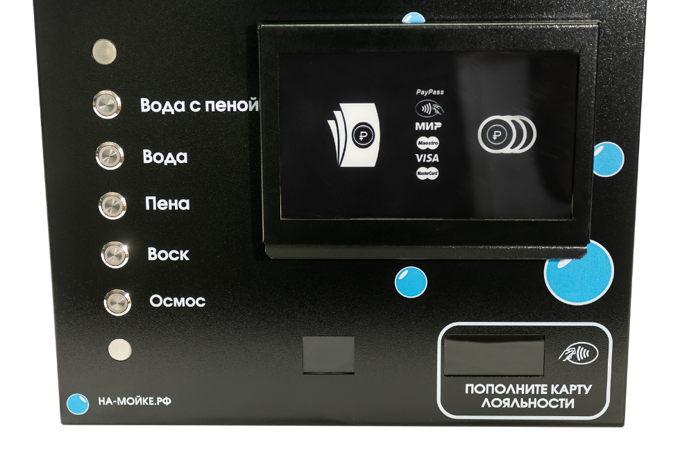 Панель управления моечным комплексом выполнена из нержавеющей стали, окрашенной порошковой краской (цвет черный). Панель имеет 6 функций, 4 из которых являются основными (вода, вода с пеной, пена и воск), а 2 дополнительных - на выбор заказчика (активная химия кузов/диски, осмос, антимоскит, продув воздухом и пылесос). Также панель имеет кнопку "пауза", которую по желанию можно заменить на другую функцию.