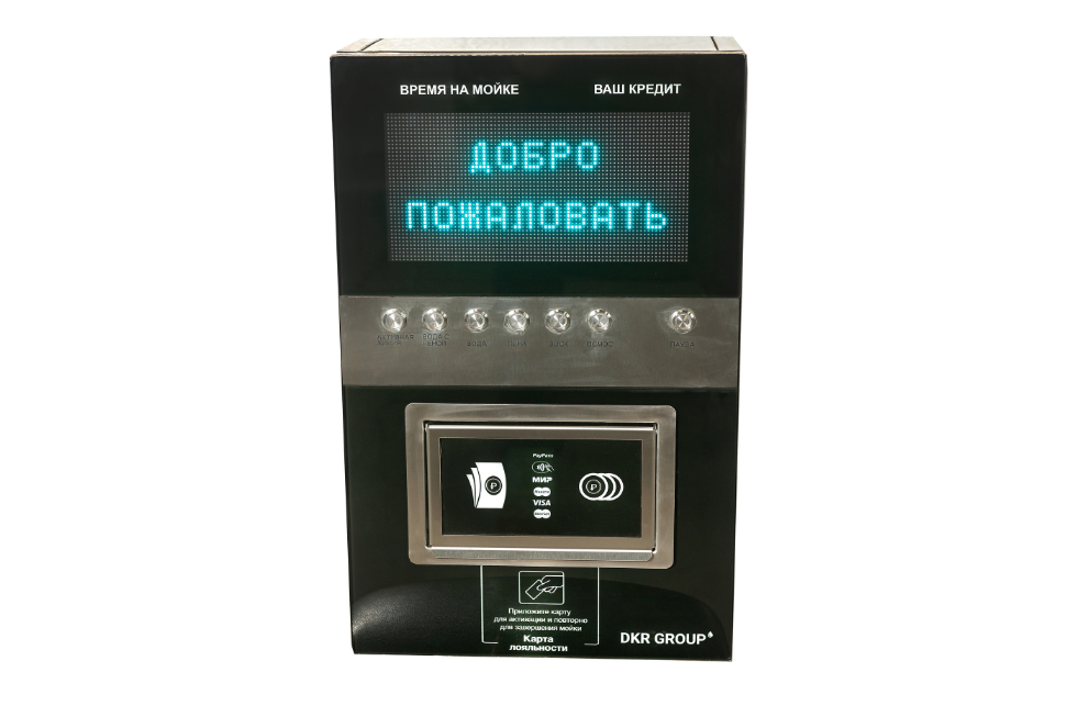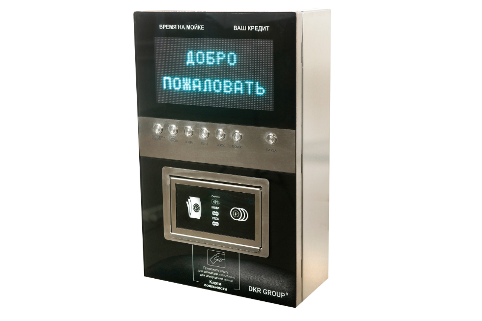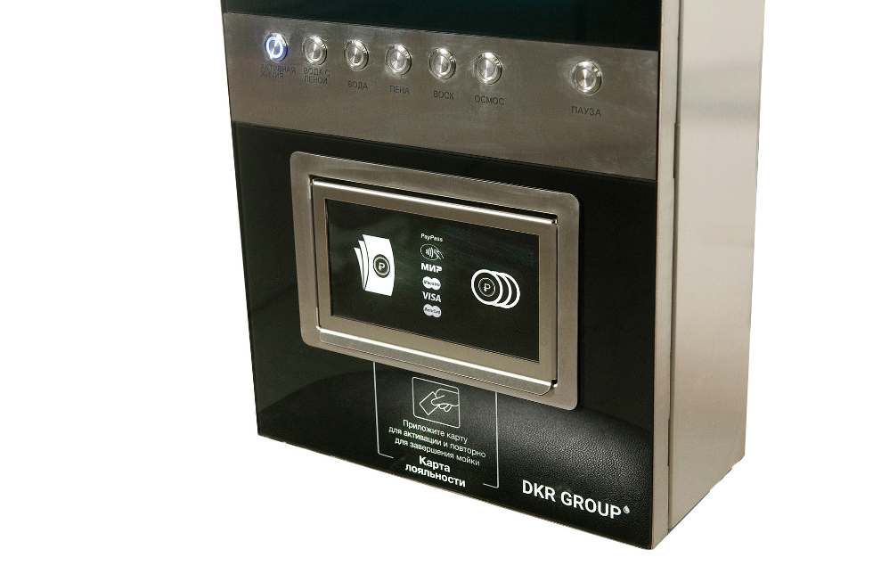 "Панель управления моечным комплексом выполнена из шлифованной нержавеющей стали, с вставкой из каленого стекла по центру. Кол-во функций на терминале до 12.
