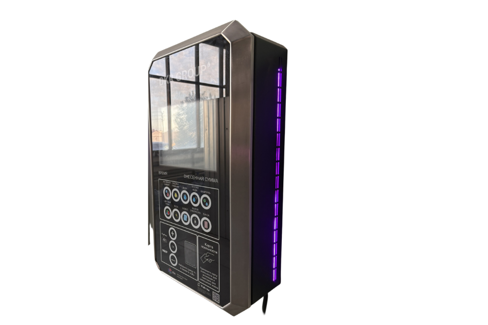 Поддерживает оплату банковской картой, купюрами , монетами, картами лояльности. Возможно брендирование по эскизу заказчика. Взаимодействия клиента происходит за счет емкостных кнопок.