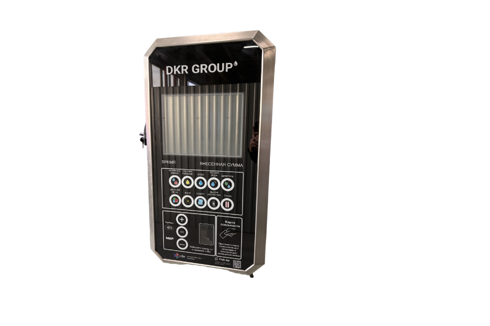 Панель управления моечным комплексом выполнена из шлифованной нержавеющей стали с пластиковым обрамлением, с вставкой из каленого стекла по центру. Кол-во функций на терминале до 12.