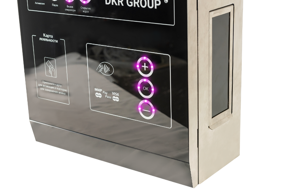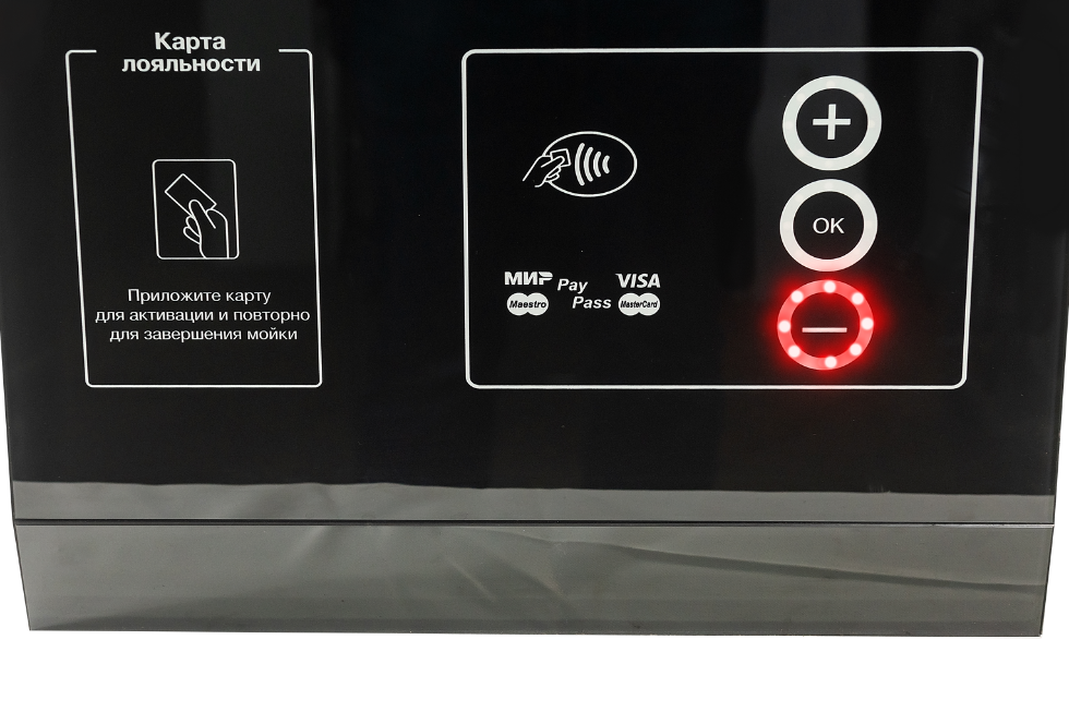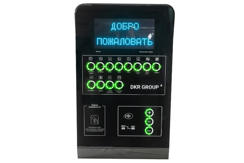 Панель управления моечным комплексом выполнена из шлифованной нержавеющей стали, с вставкой из каленого стекла по центру. Кол-во функций на терминале до 12.